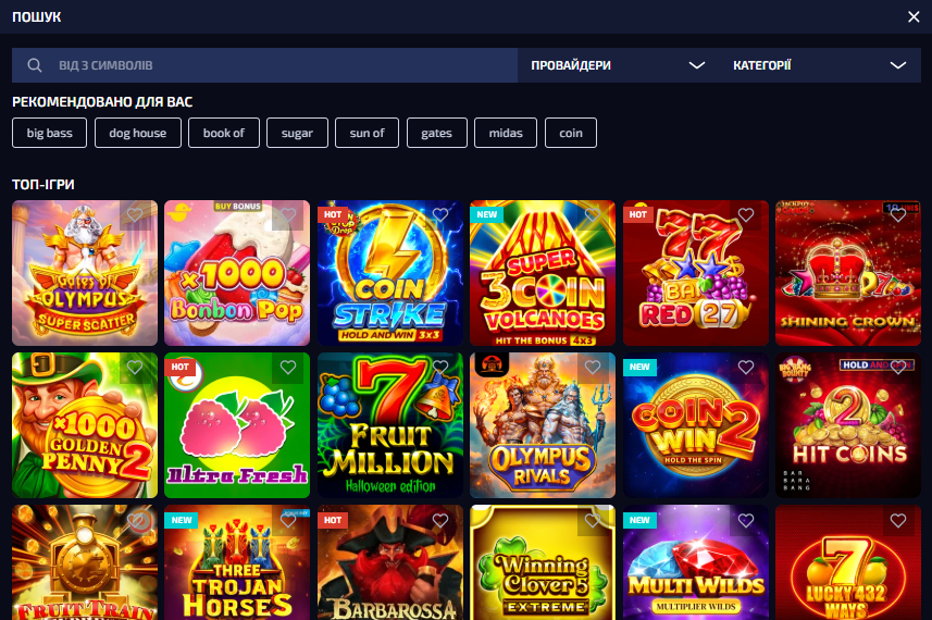 - Поисковая строка быстро находит нужный слот по названию провайдера